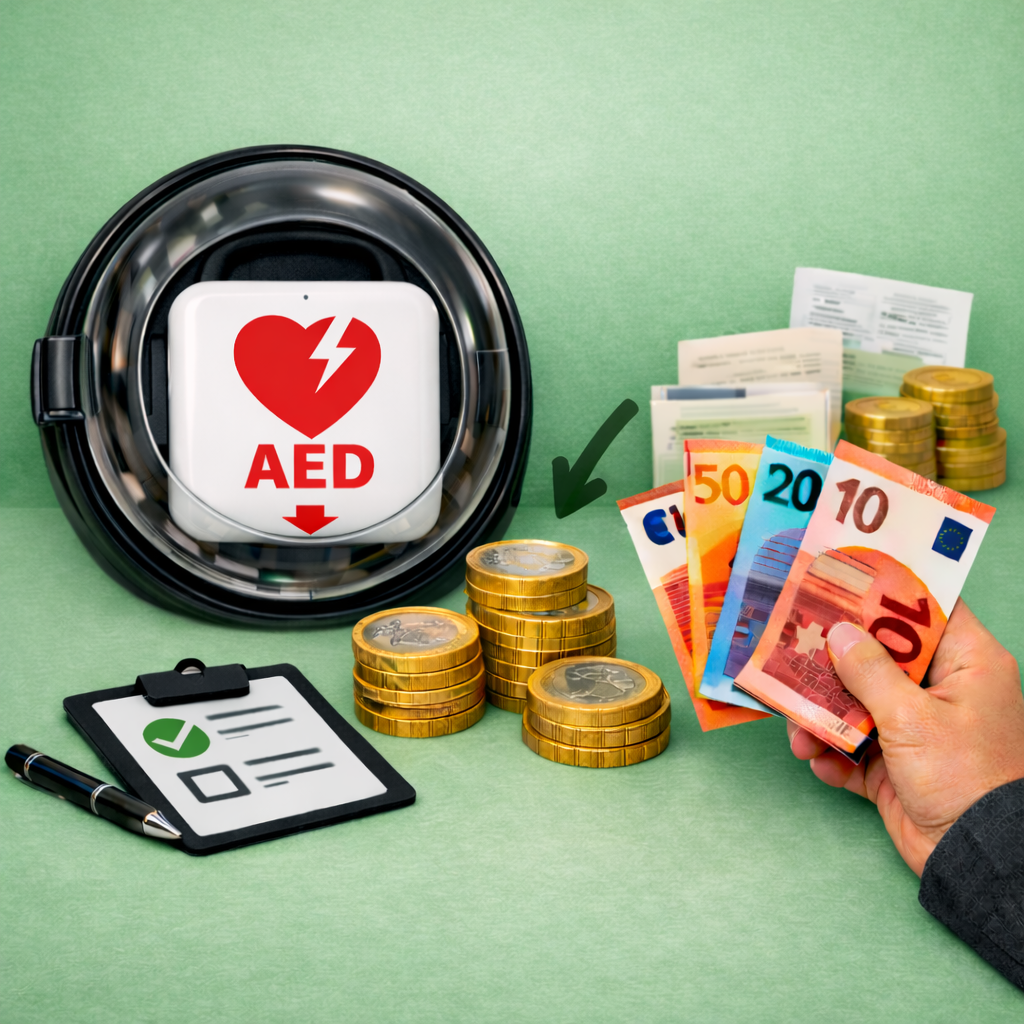 De vergoeding van 90% geldt voor zowel de AED als voor het onderhoudscontract van twee keer vijf jaar die daar bij hoort. De prijs voor een AED inclusief onderhoudscontract komt hiermee op €426.- Deze prijs is exclusief kast.